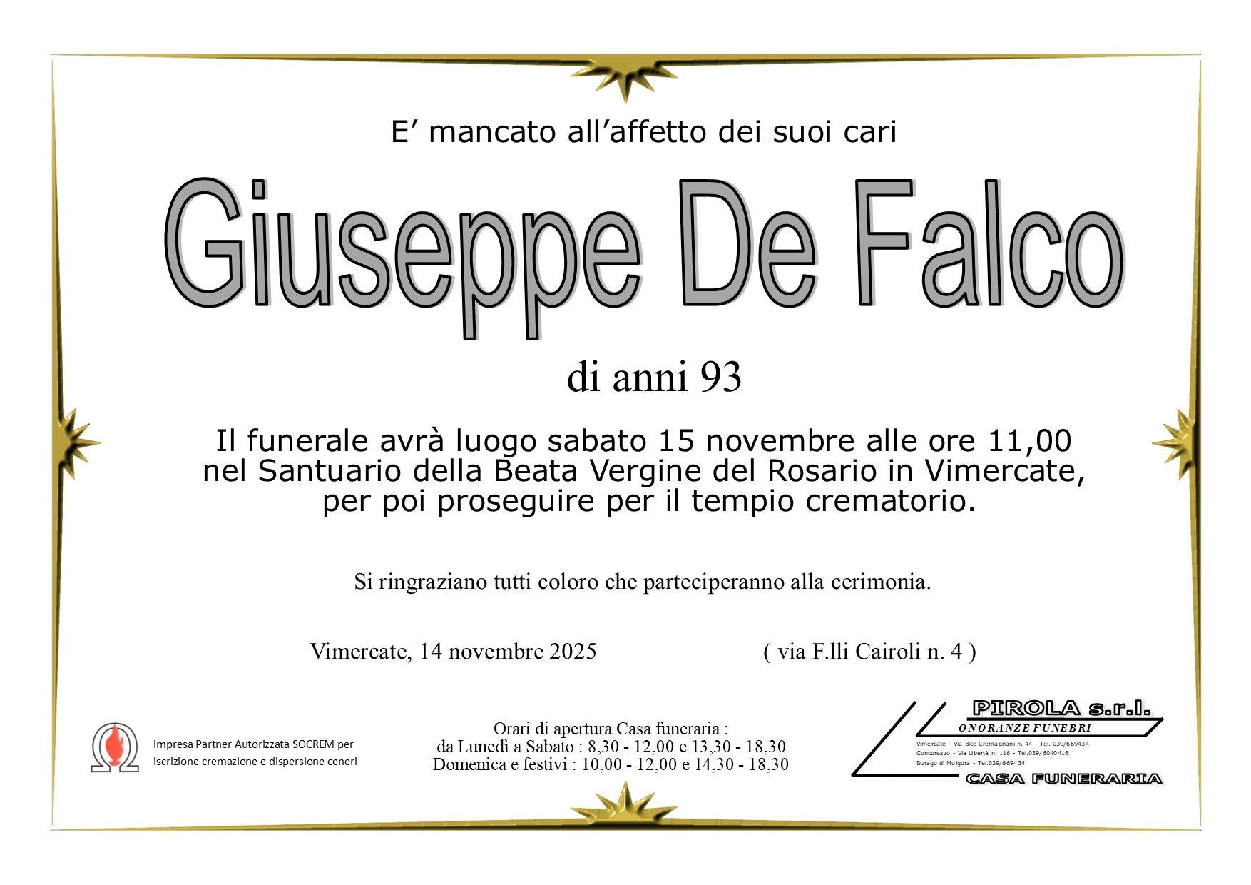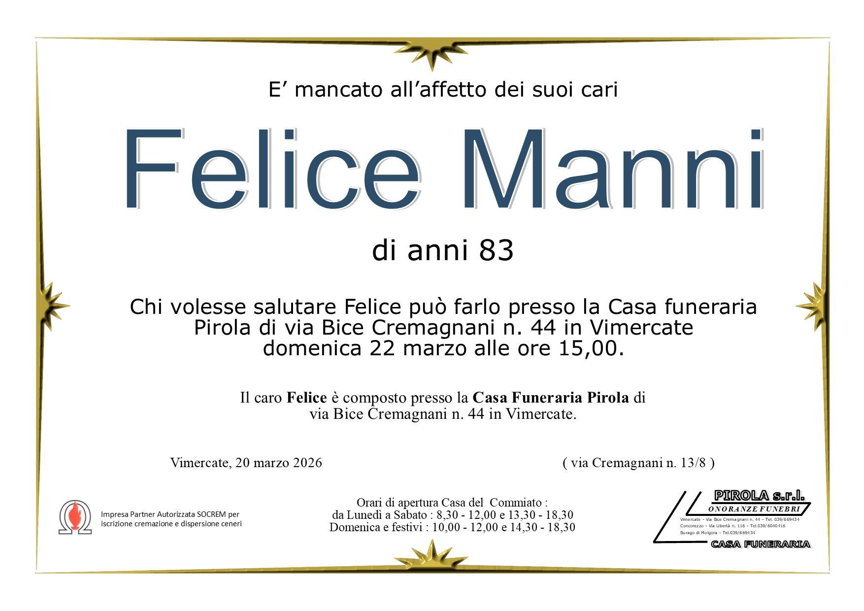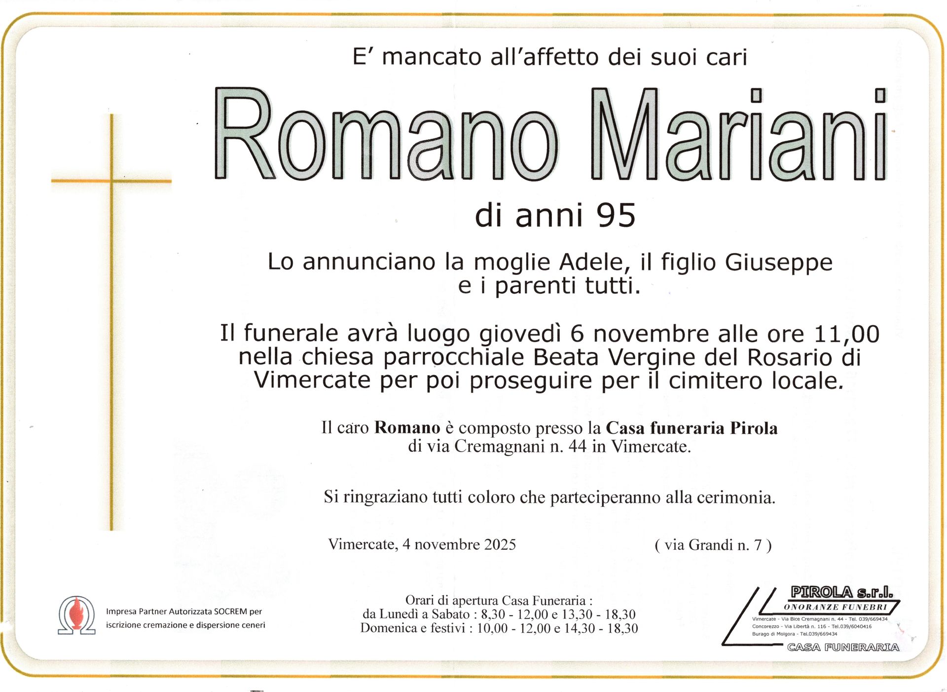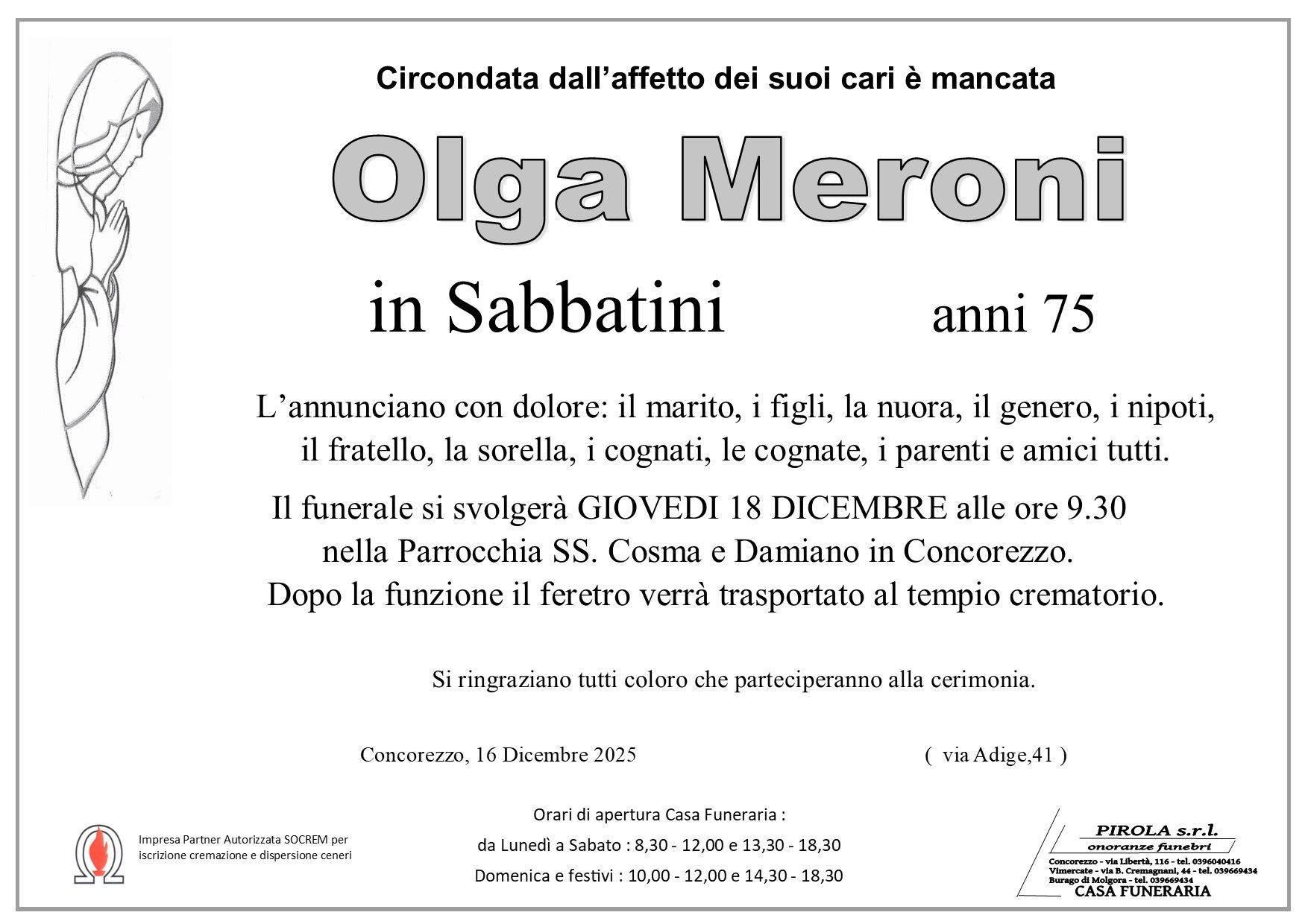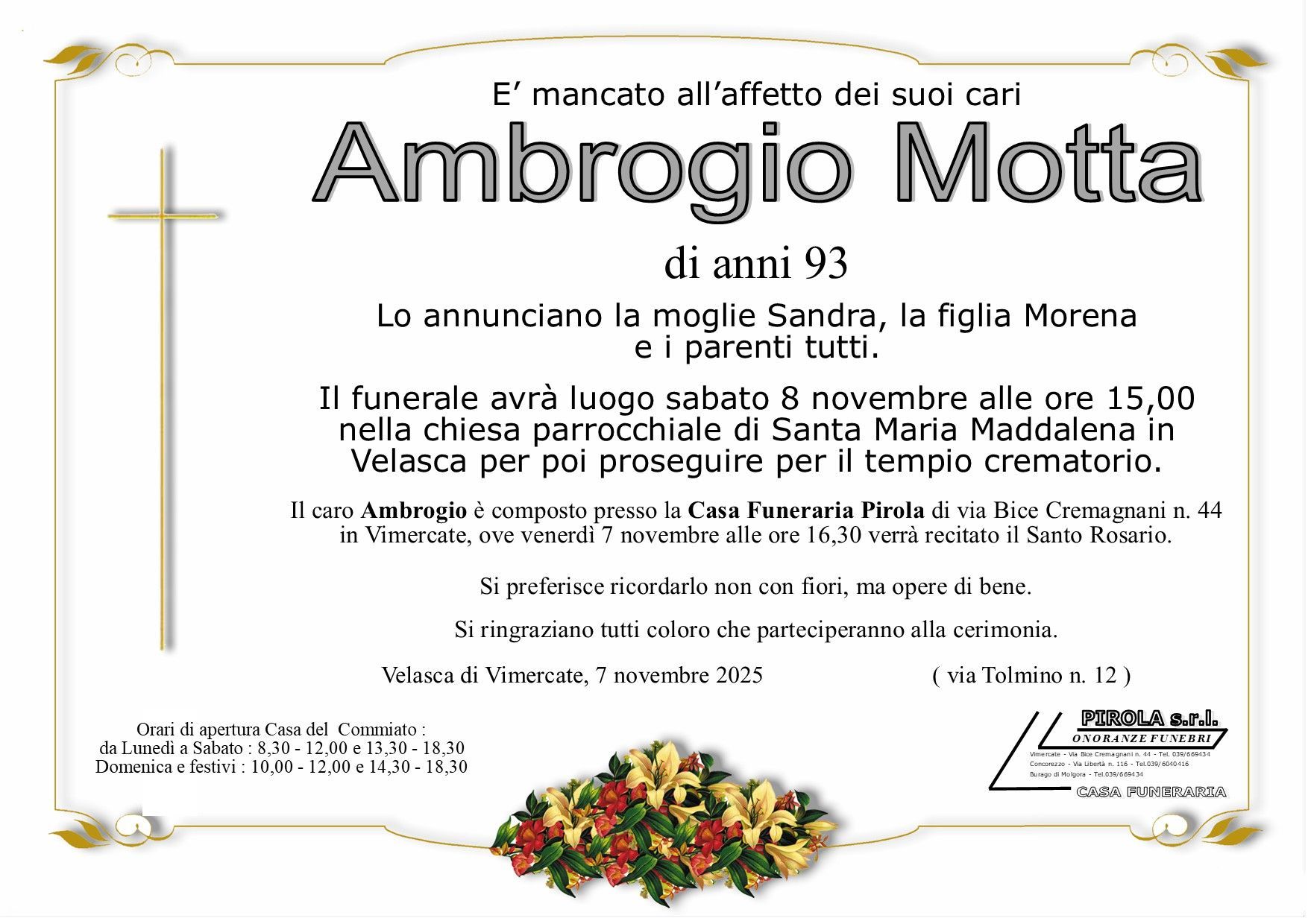 In questa sezione dei necrologi funebri viene offerta anche la possibilità di inviare un messaggio di condoglianze alla famiglia del defunto tramite la nostra agenzia.
