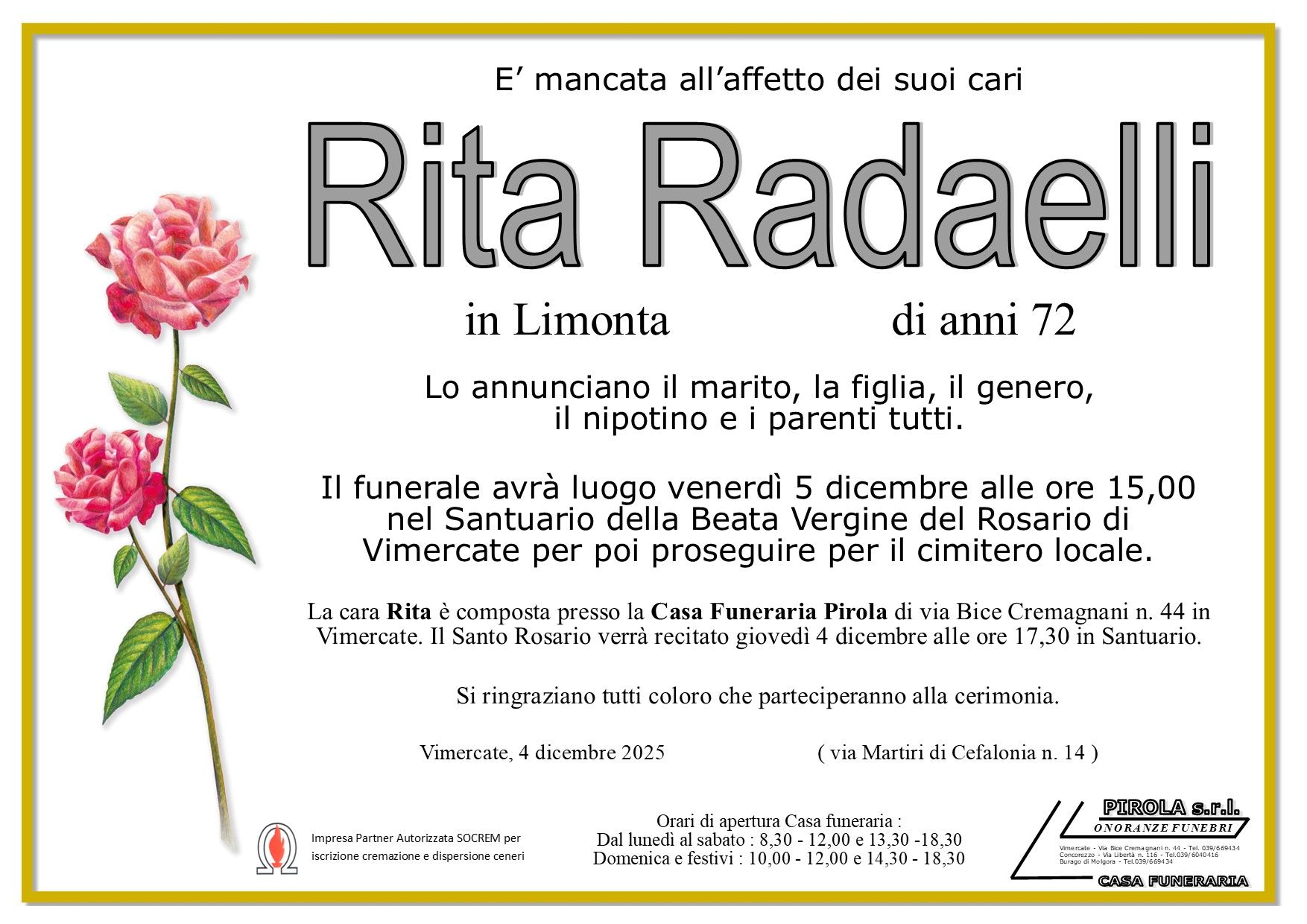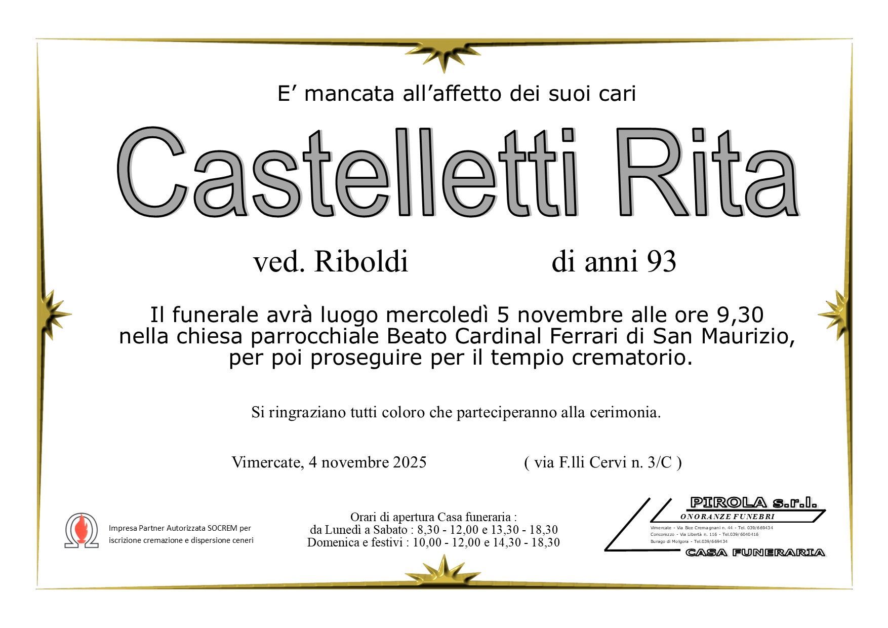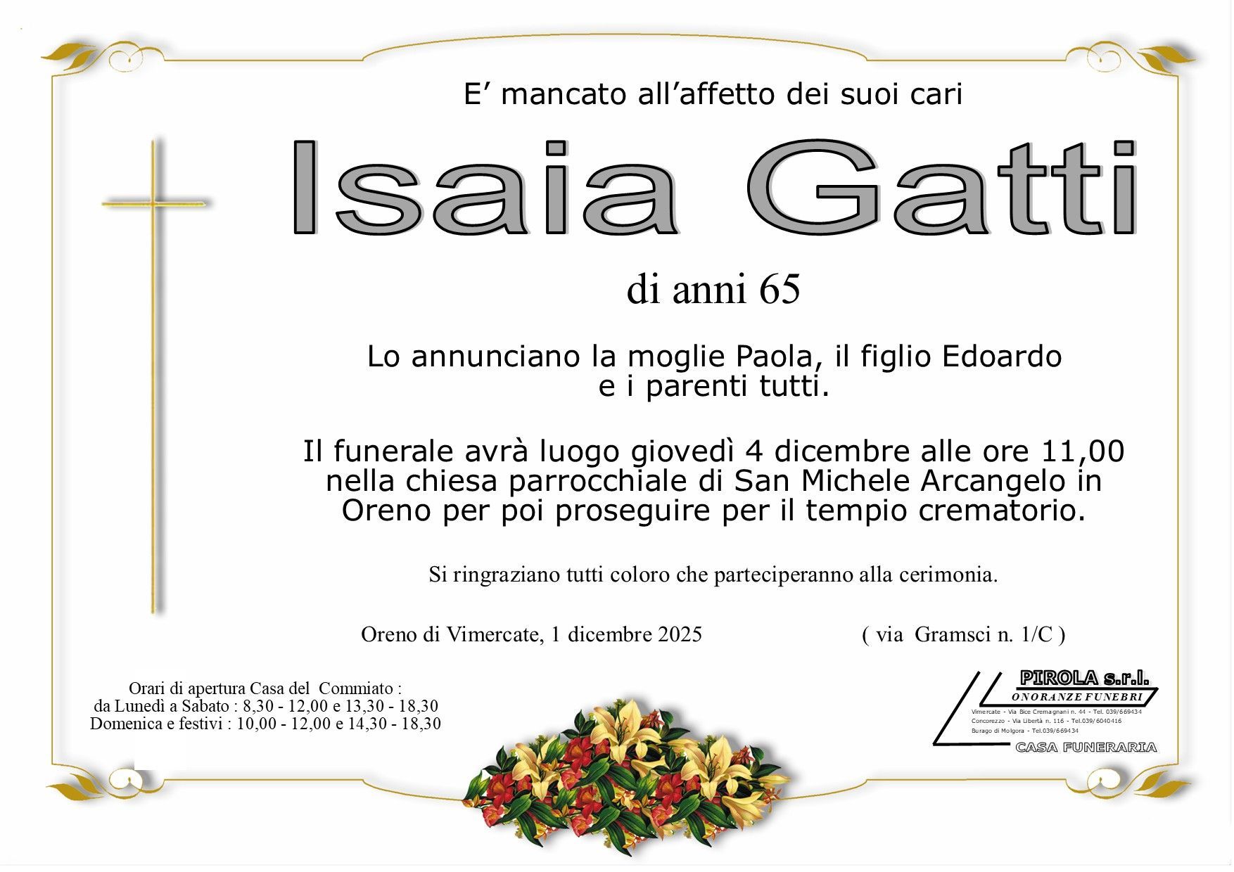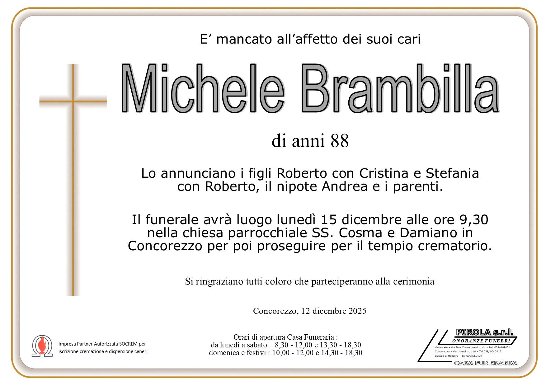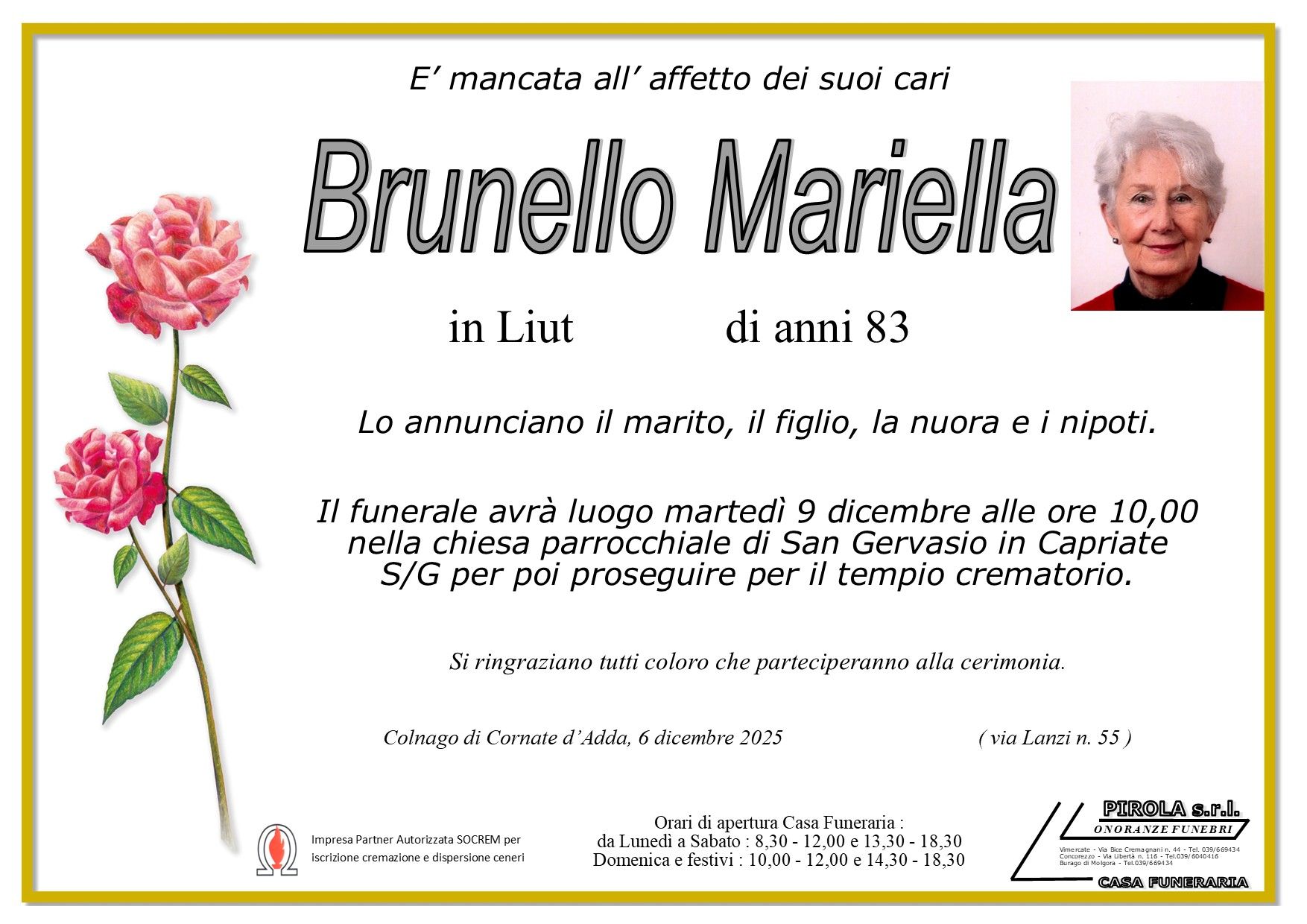 In questa sezione dei necrologi funebri viene offerta anche la possibilità di inviare un messaggio di condoglianze alla famiglia del defunto tramite la nostra agenzia.