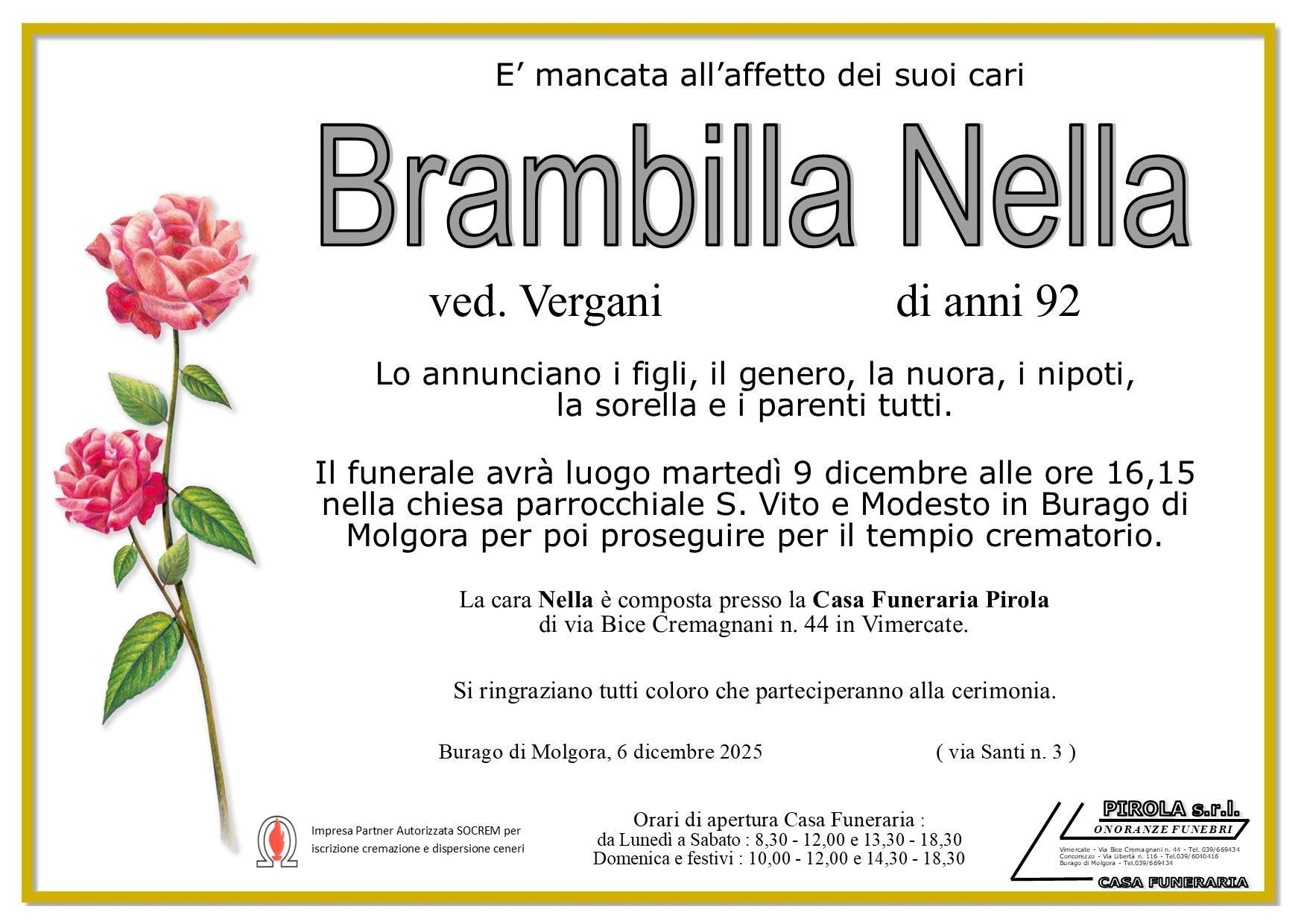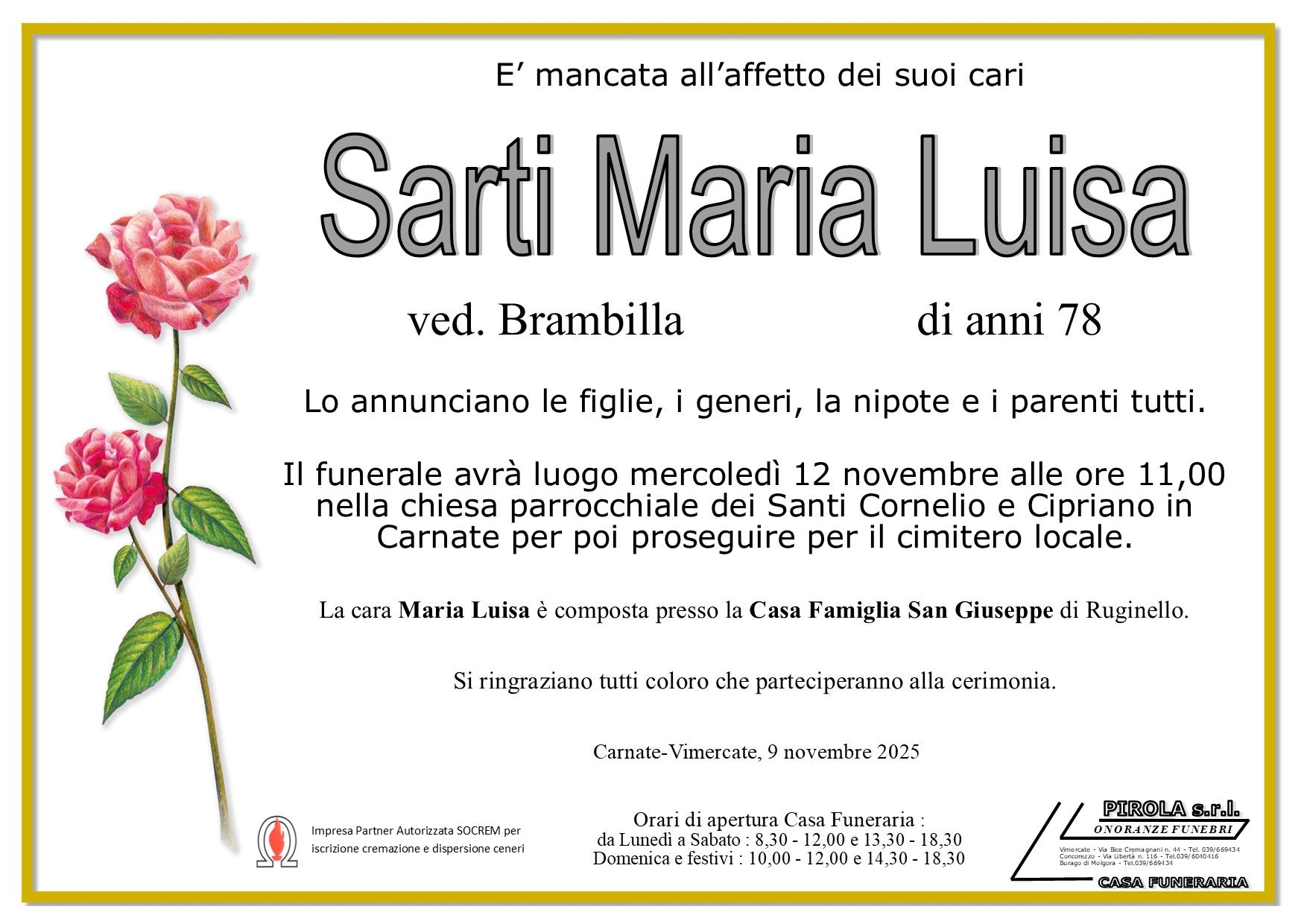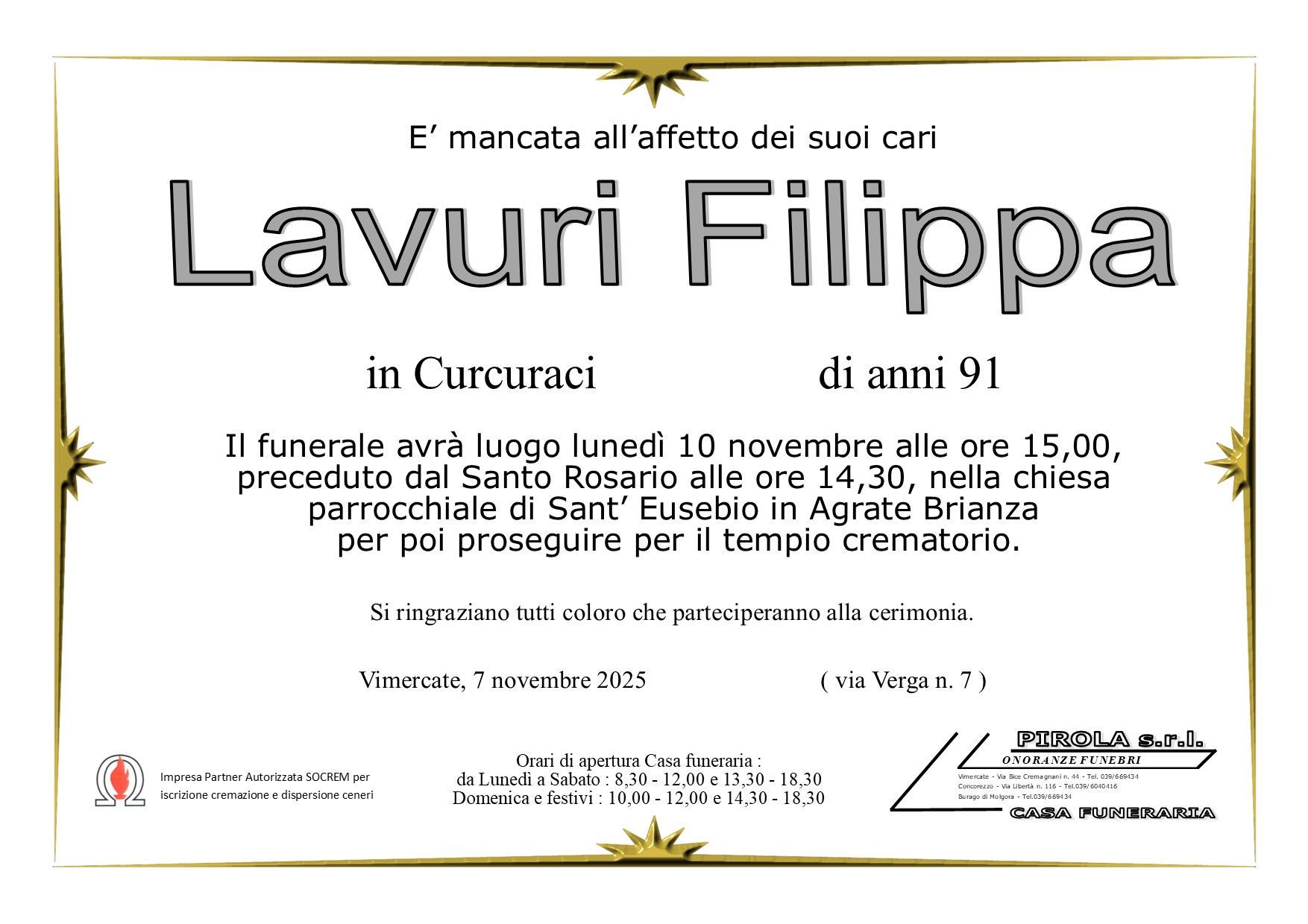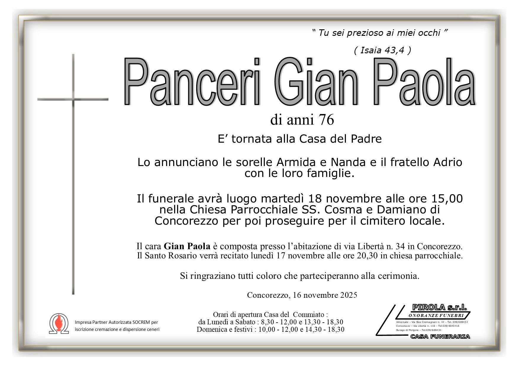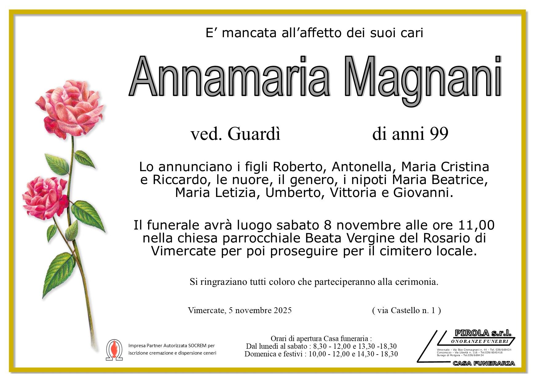 In questa sezione dei necrologi funebri viene offerta anche la possibilità di inviare un messaggio di condoglianze alla famiglia del defunto tramite la nostra agenzia.