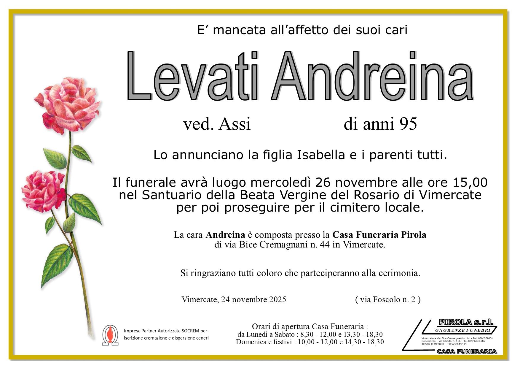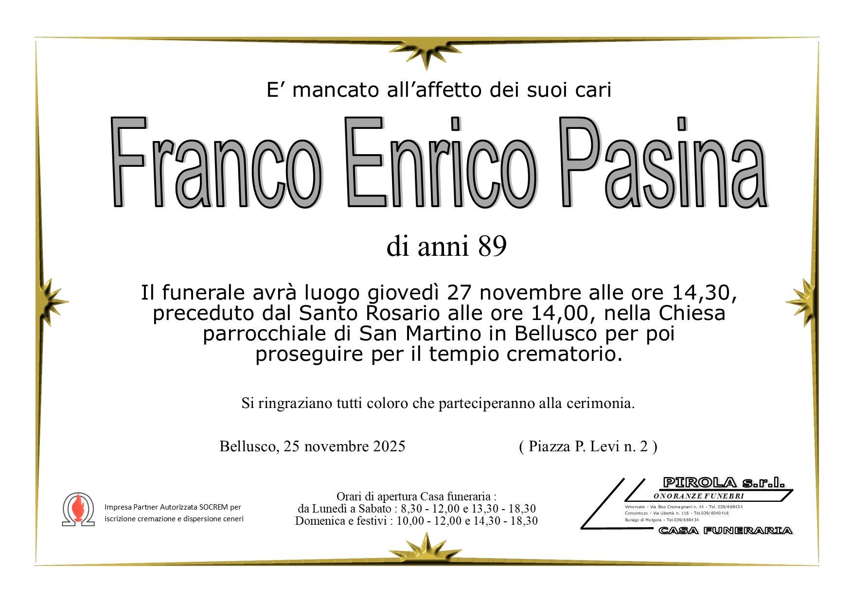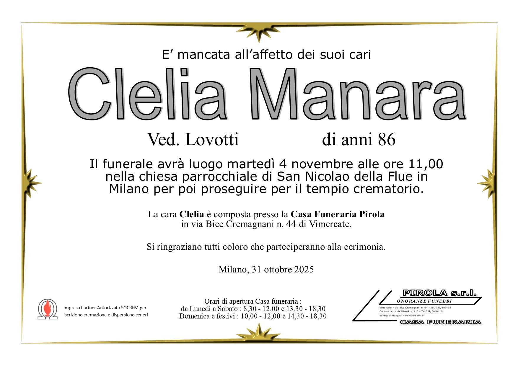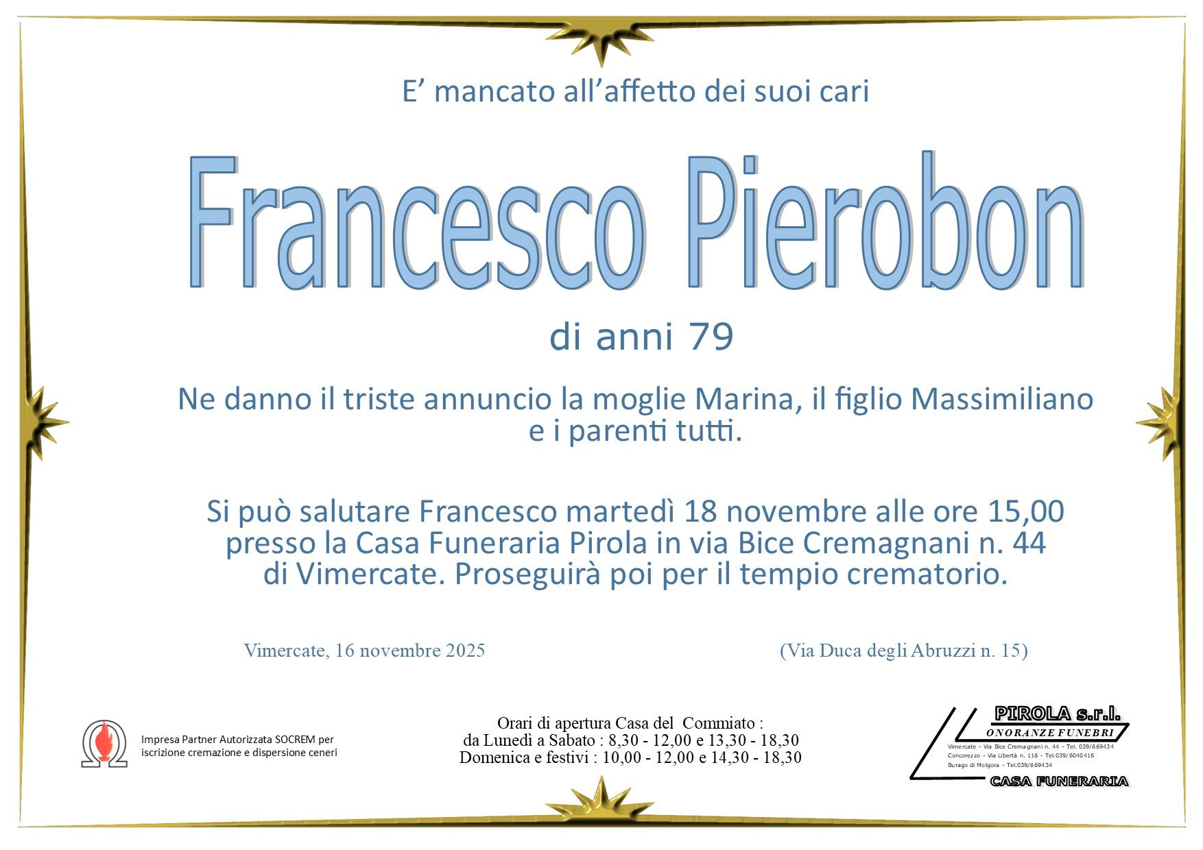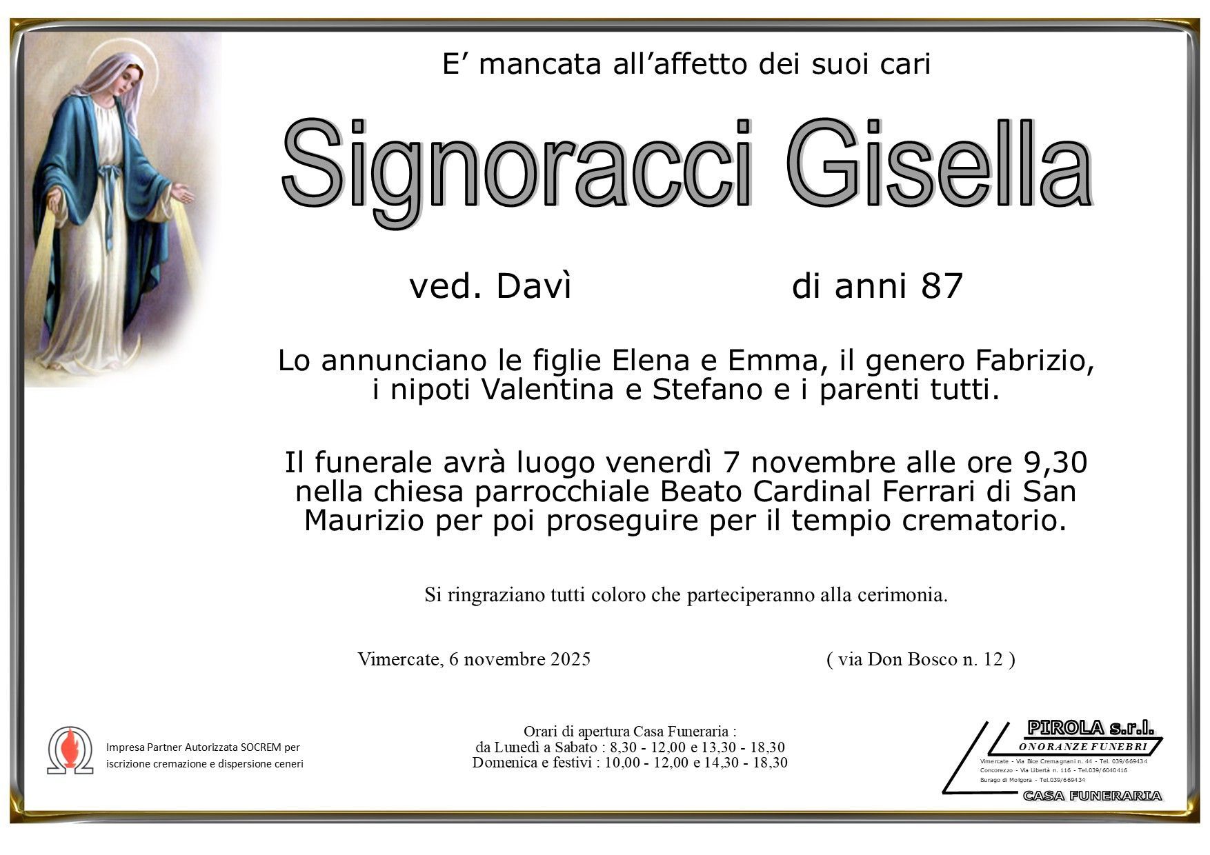 In questa sezione dei necrologi funebri viene offerta anche la possibilità di inviare un messaggio di condoglianze alla famiglia del defunto tramite la nostra agenzia.