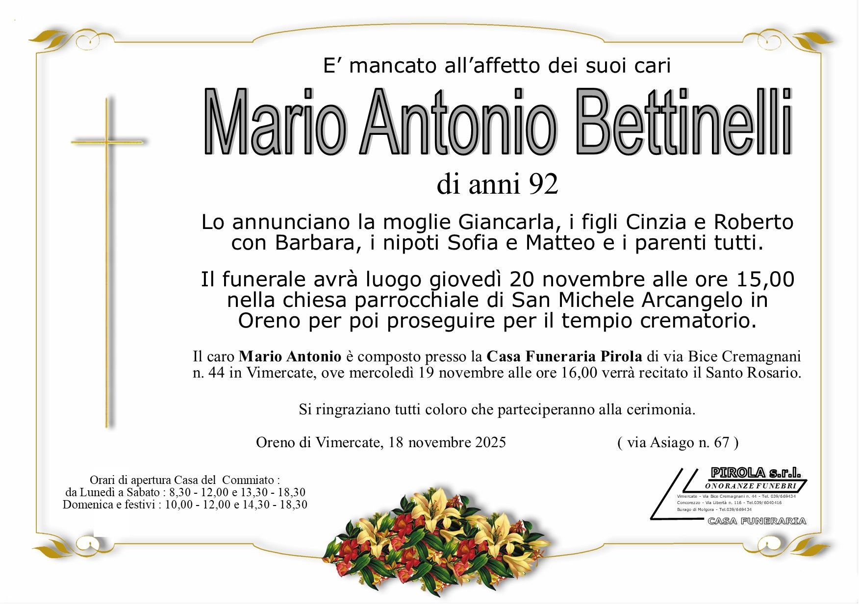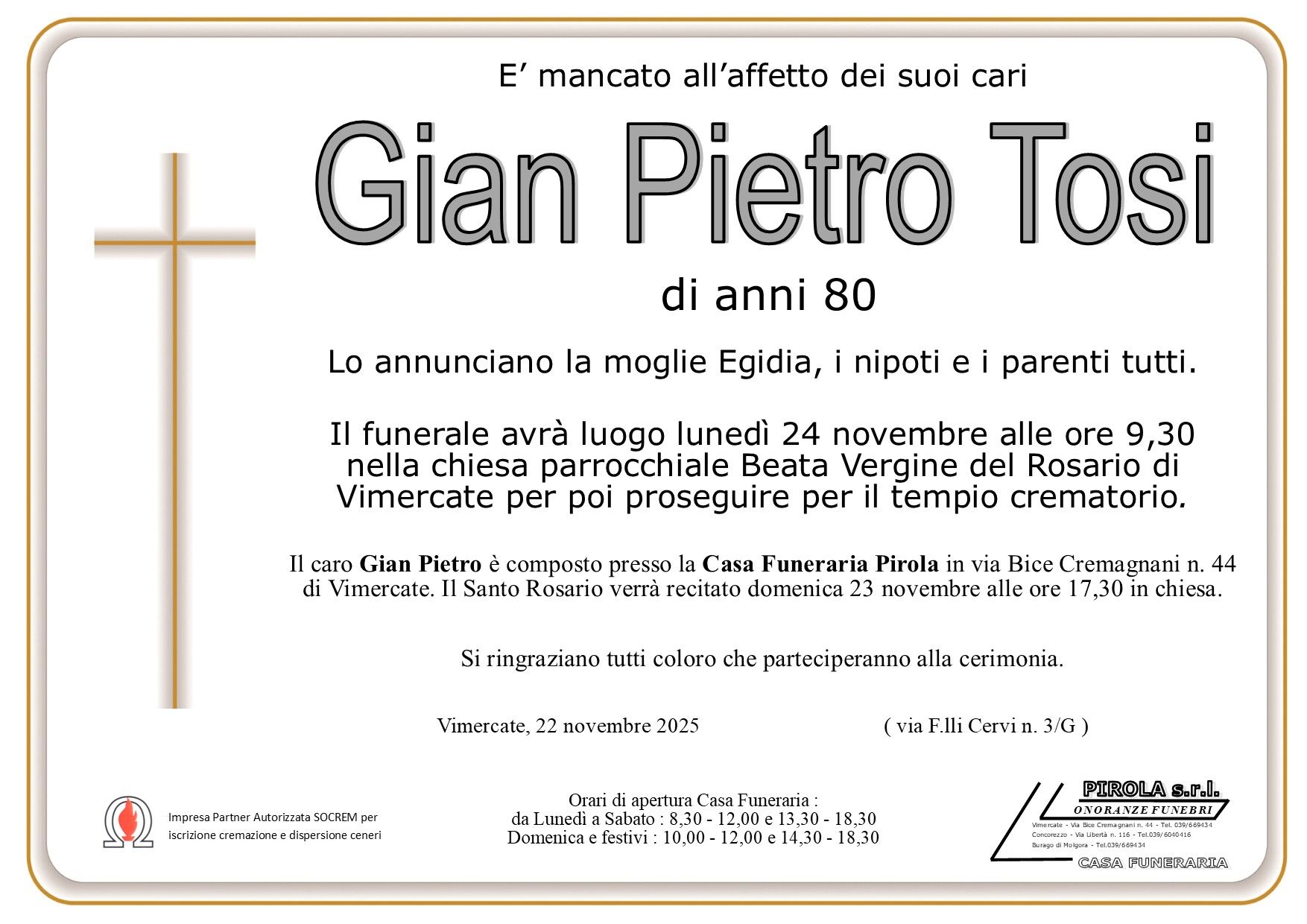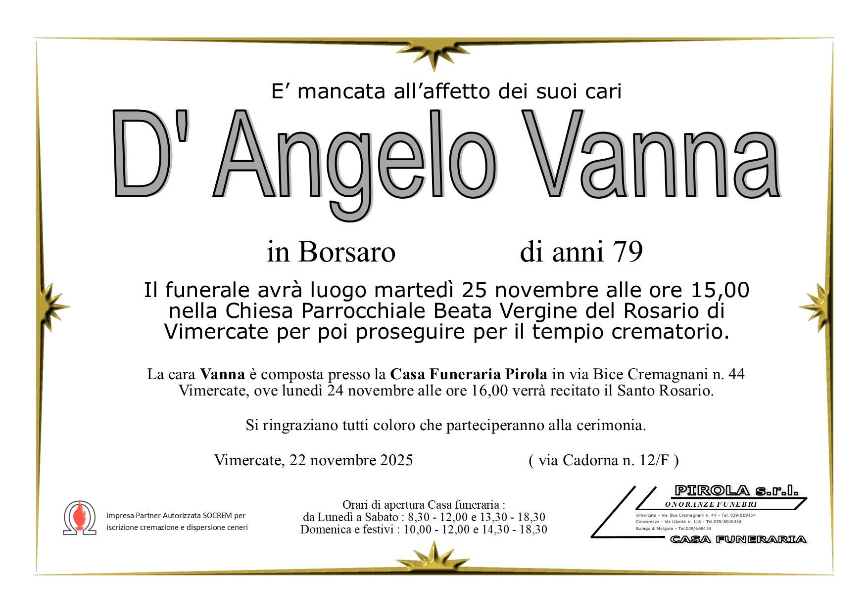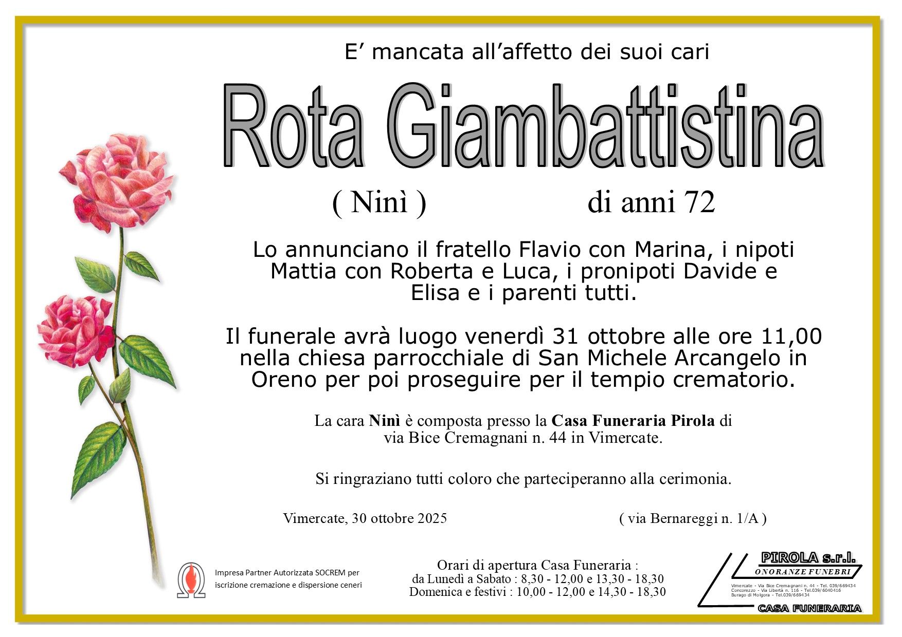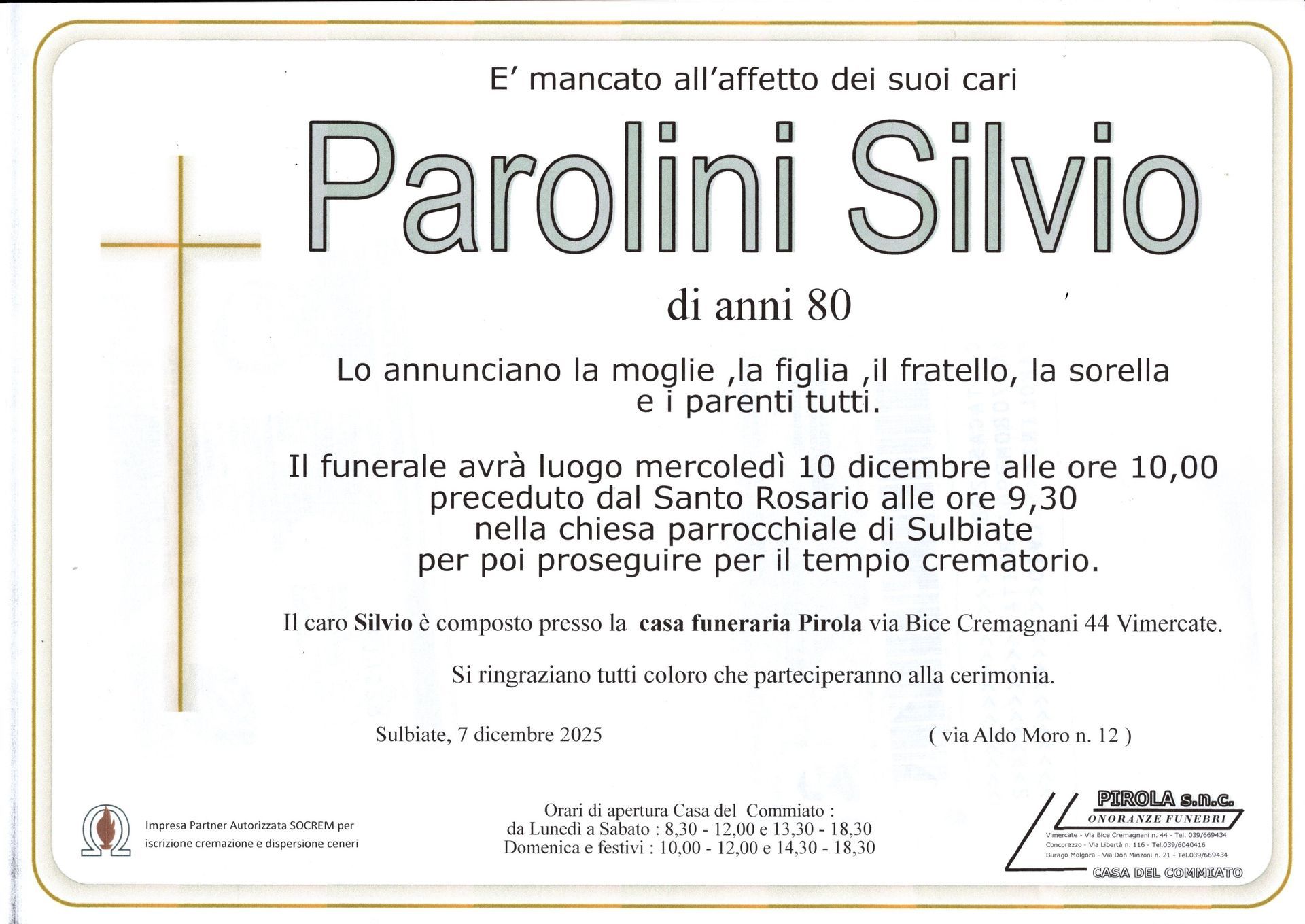 In questa sezione dei necrologi funebri viene offerta anche la possibilità di inviare un messaggio di condoglianze alla famiglia del defunto tramite la nostra agenzia.