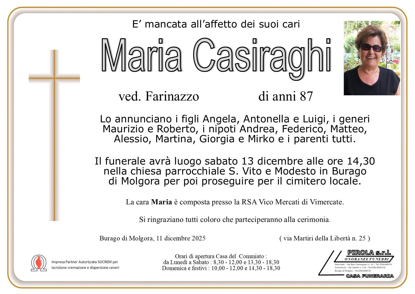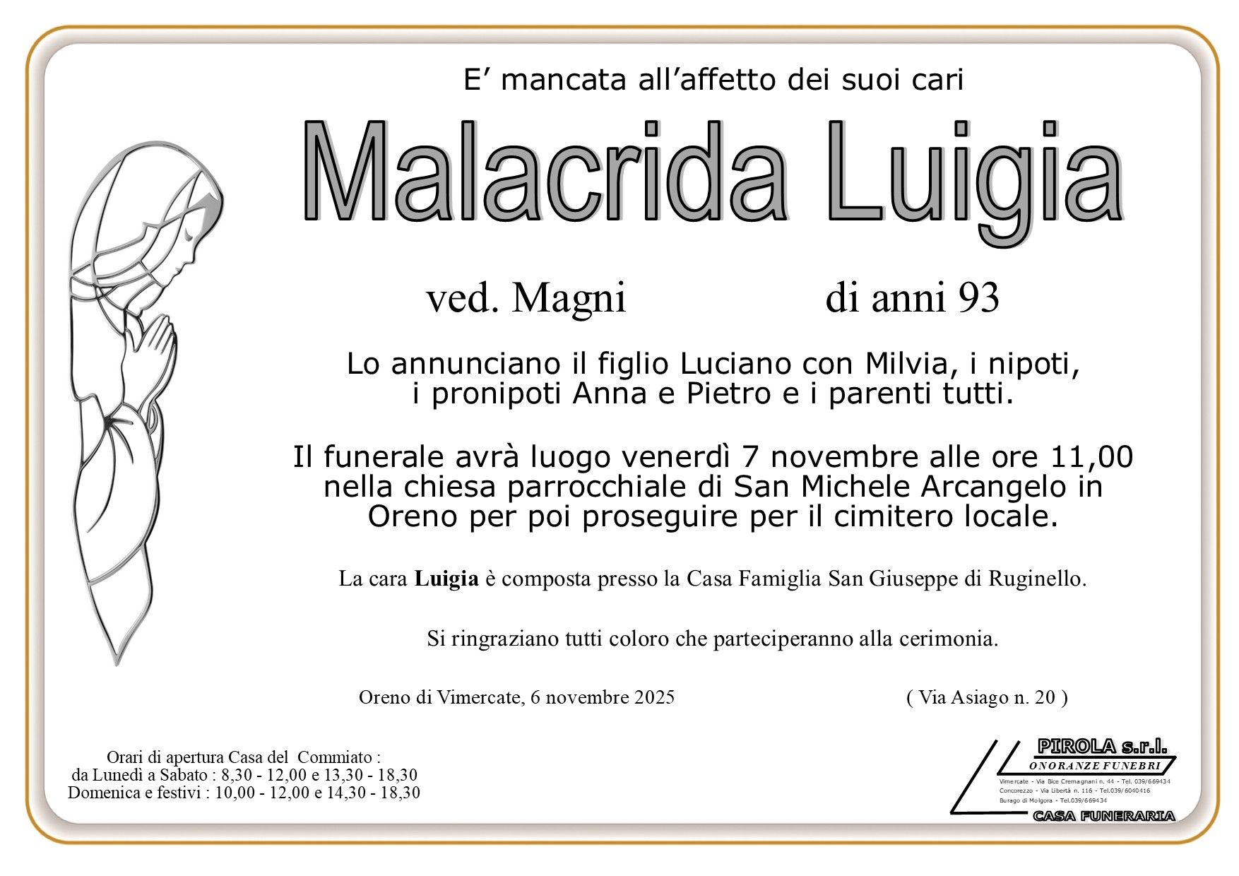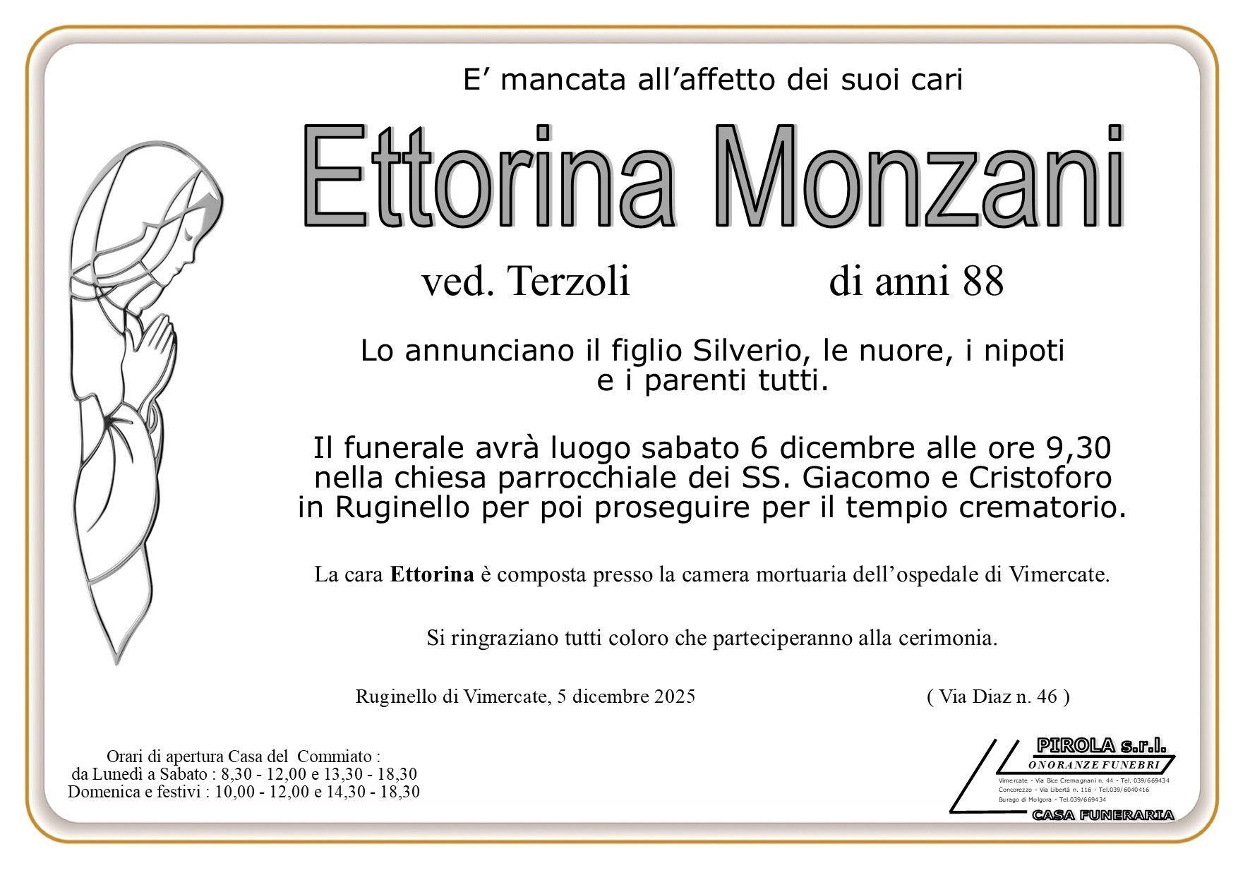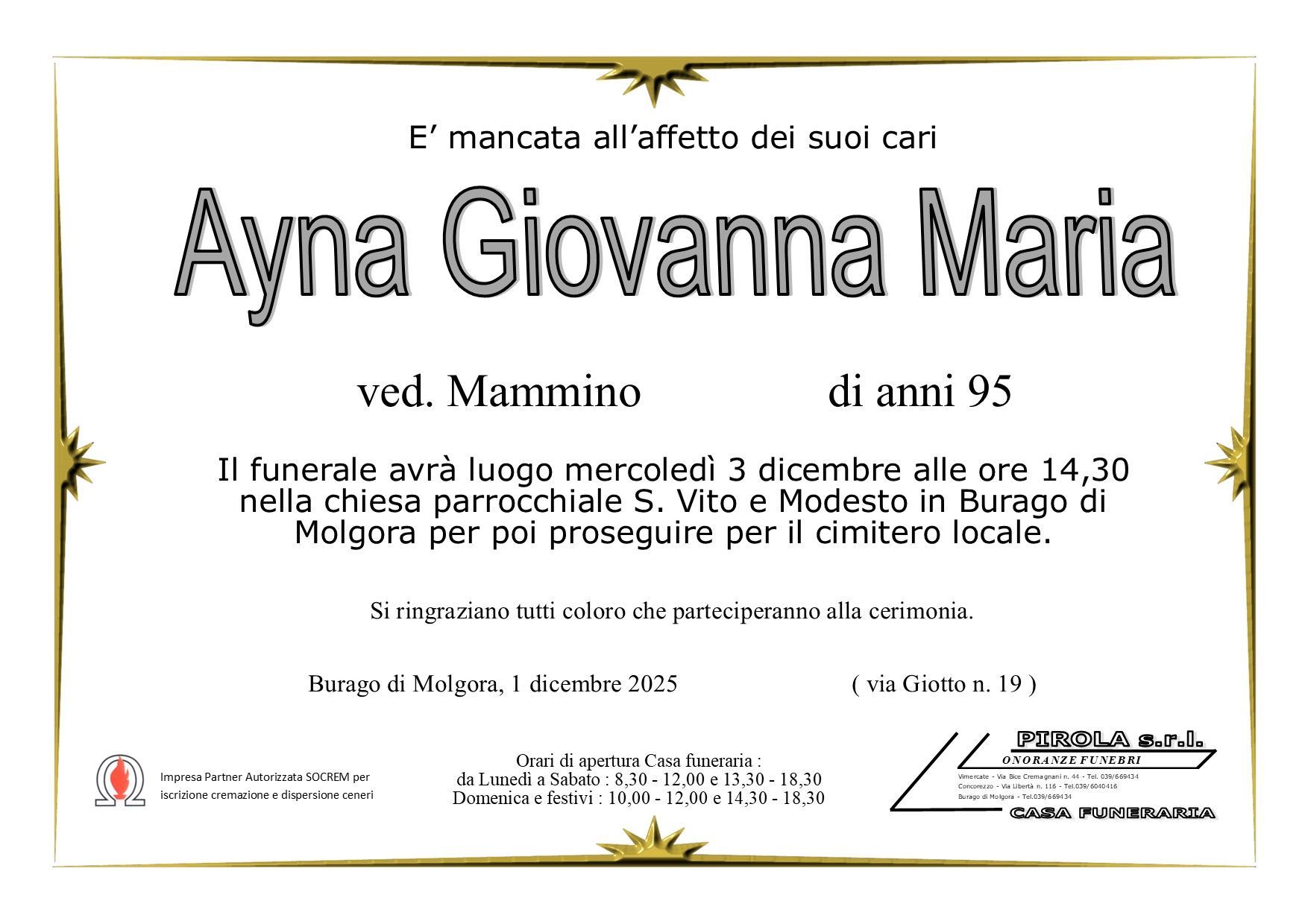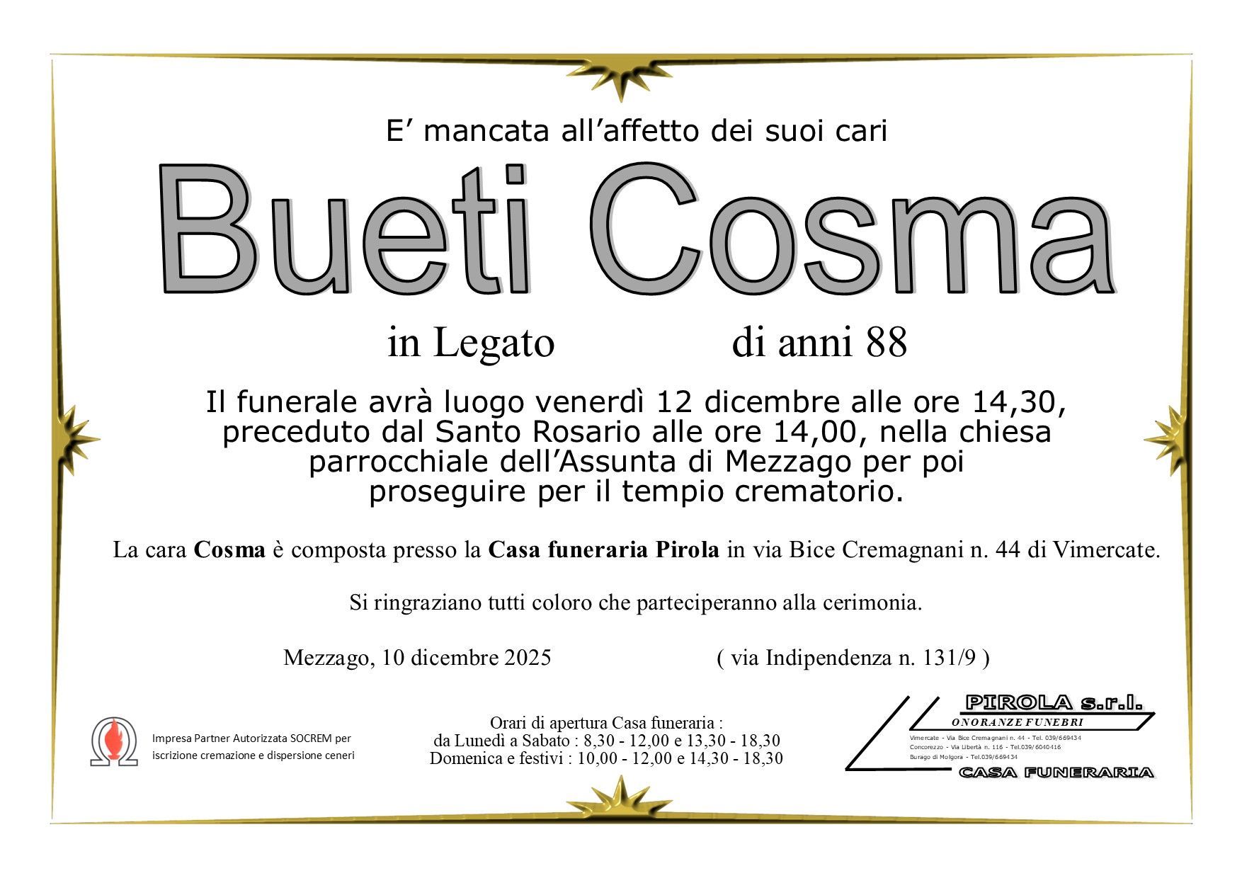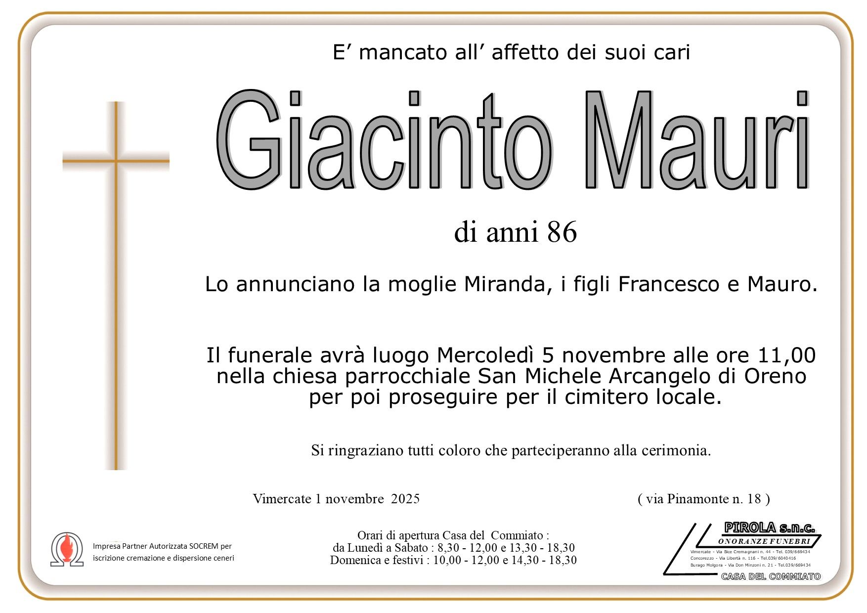 In questa sezione dei necrologi funebri viene offerta anche la possibilità di inviare un messaggio di condoglianze alla famiglia del defunto tramite la nostra agenzia.