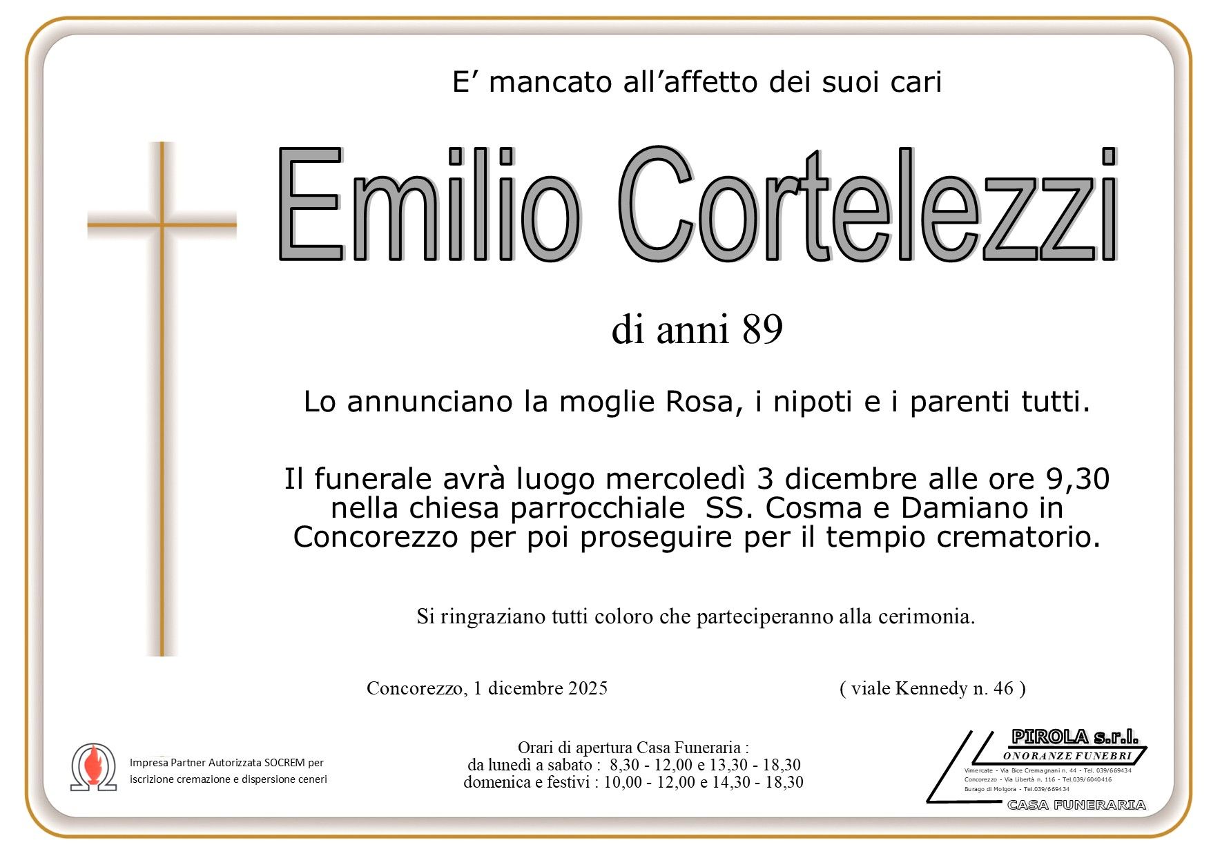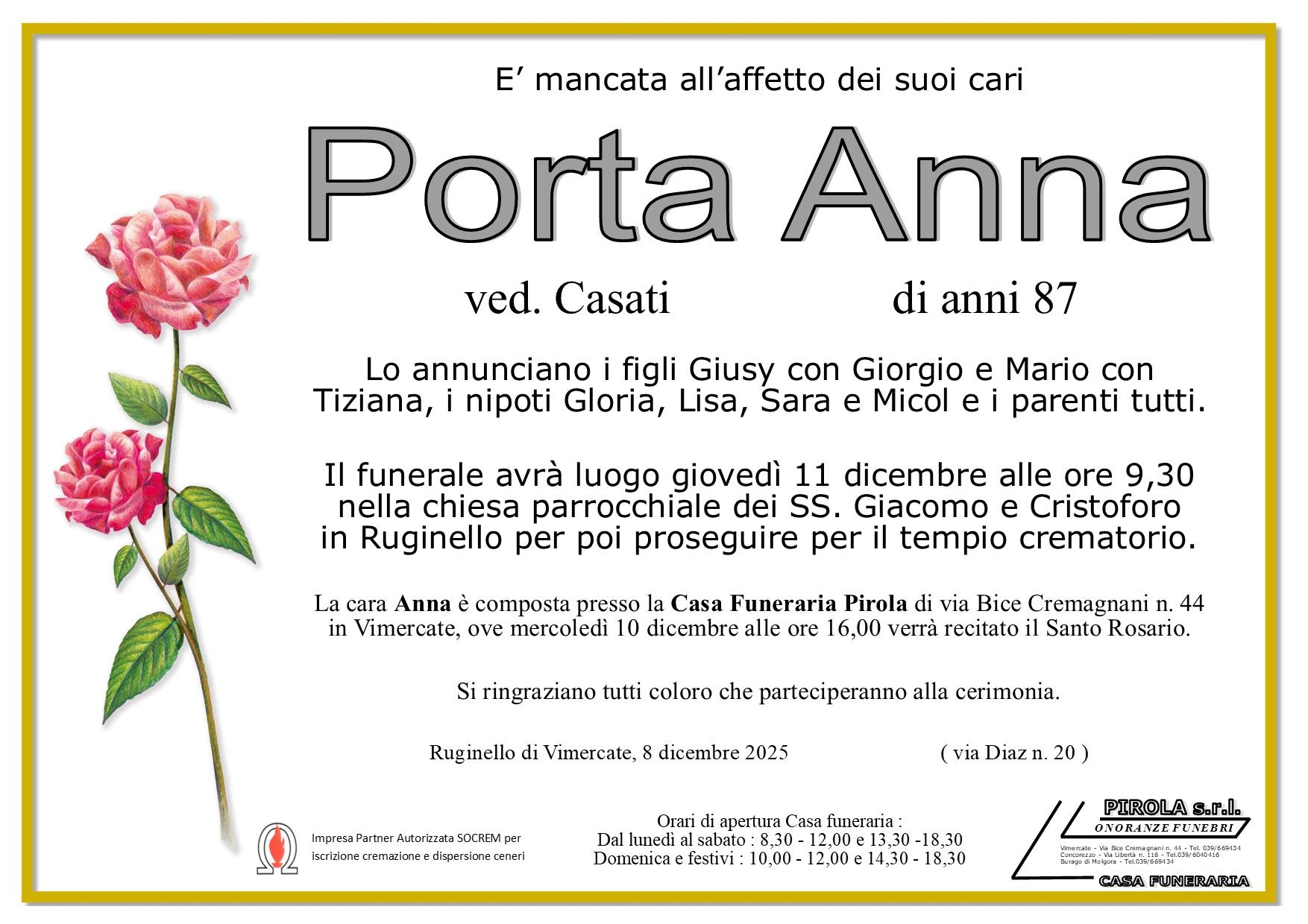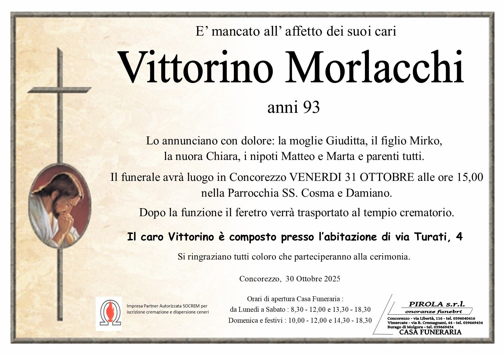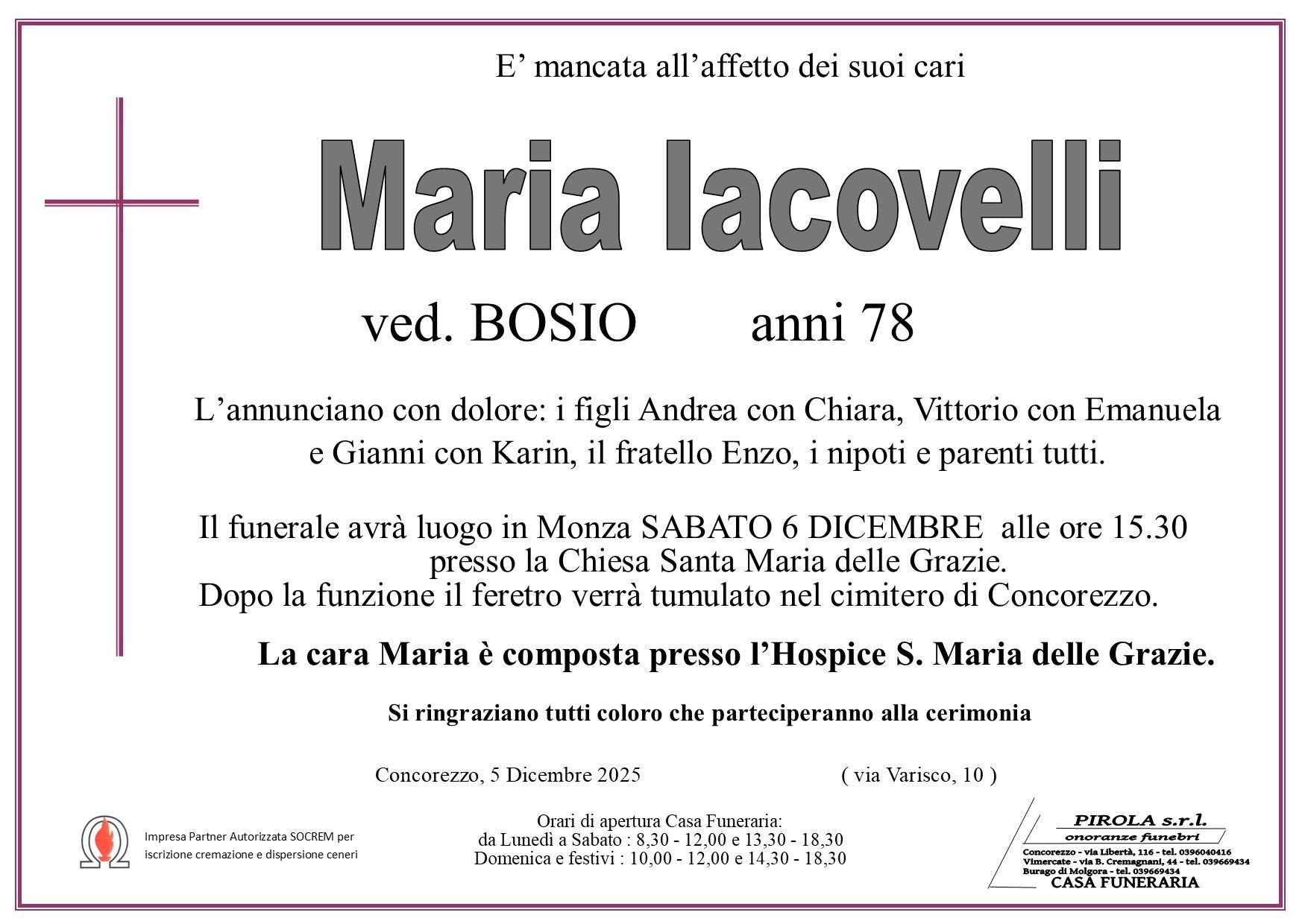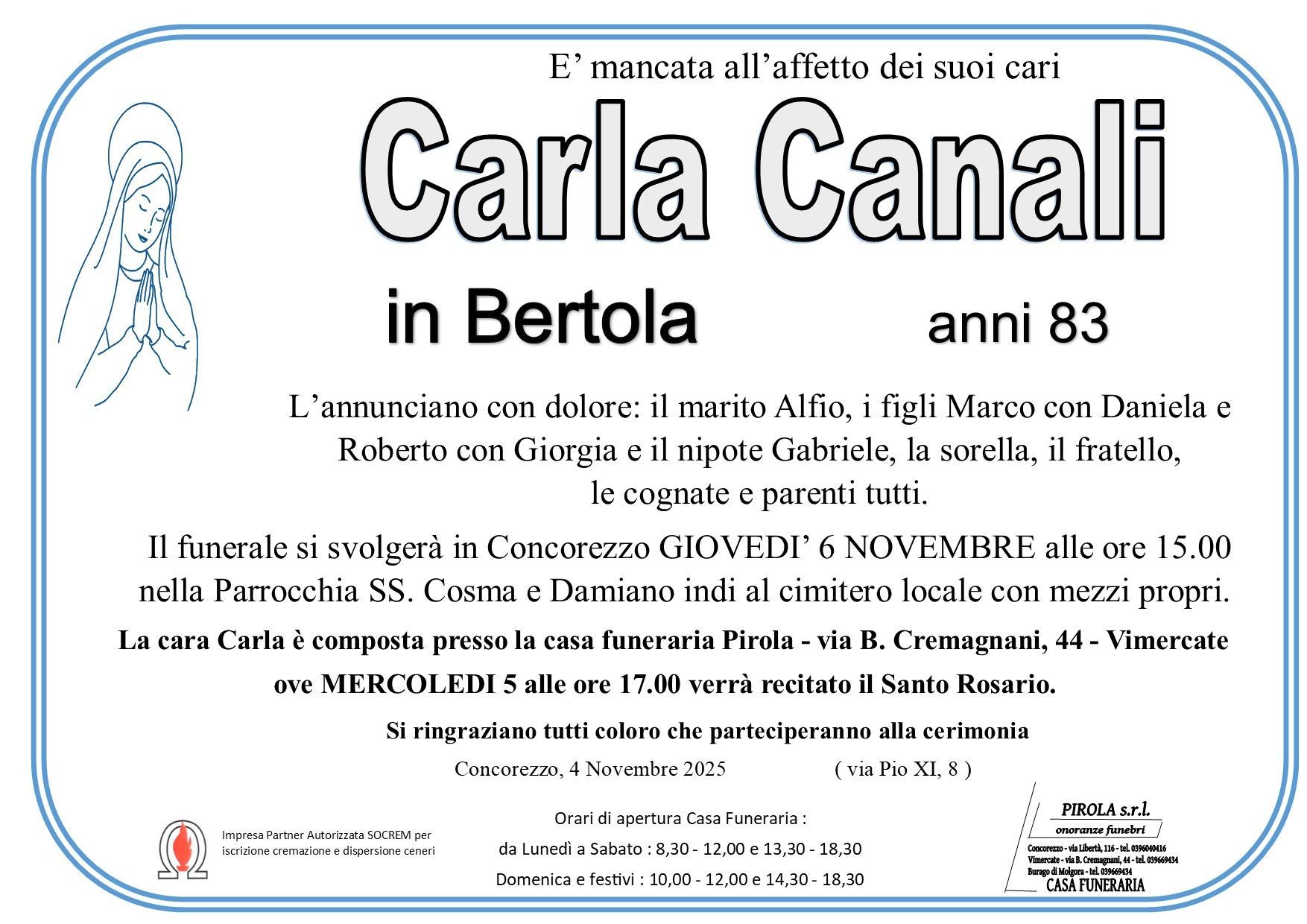 In questa sezione dei necrologi funebri viene offerta anche la possibilità di inviare un messaggio di condoglianze alla famiglia del defunto tramite la nostra agenzia.